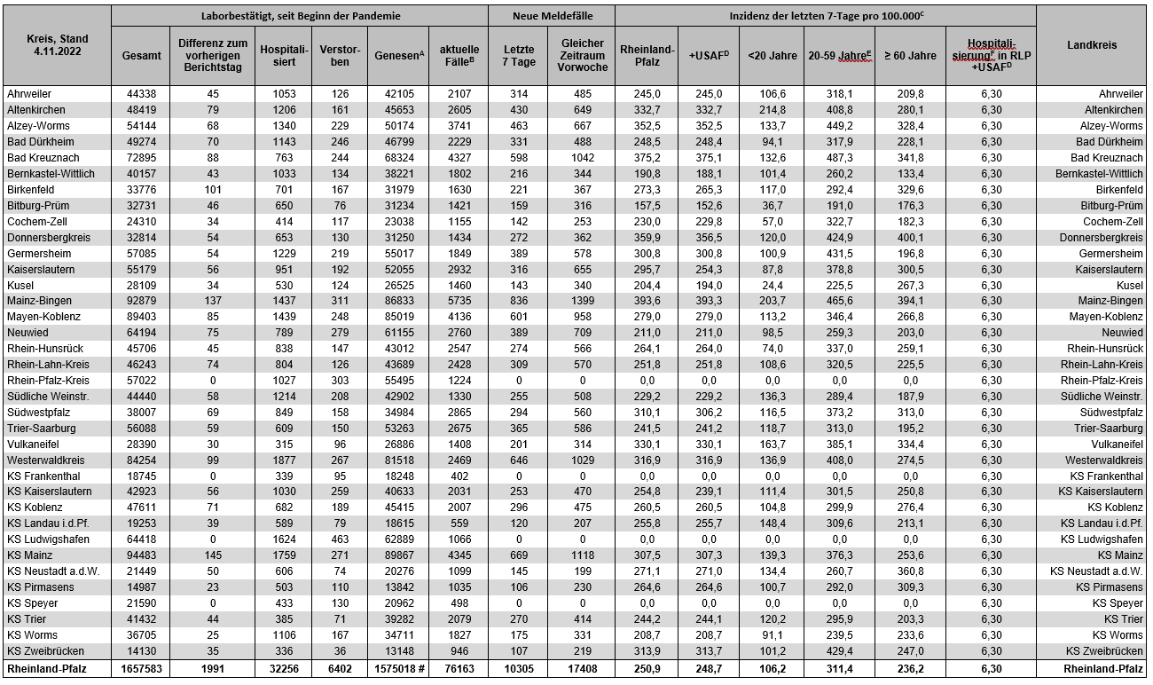Coronavirus SARS-CoV-2: Fallzahlen für Rheinland-Pfalz, (Datenstand vom 04.11.2022, 14:10 Uhr)