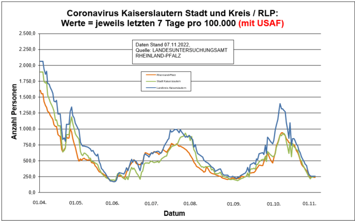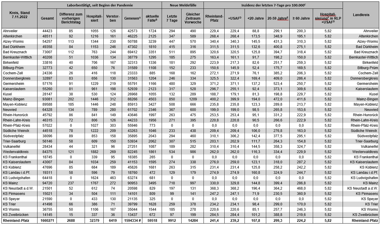 Coronavirus SARS-CoV-2: Fallzahlen für Rheinland-Pfalz, (Datenstand vom 07.11.2022, 14:10 Uhr)