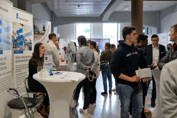 BU: Dichtgedrängt: Zur Firmenkontaktmesse der Hochschule Kaiserslautern kamen zahlreiche namhafte Unternehmen sowie viele Studierende. Und das mit Erfolg – denn erste Bande wurden geknüpft und konkrete Jobangebote diskutiert. (Foto: HSKL)