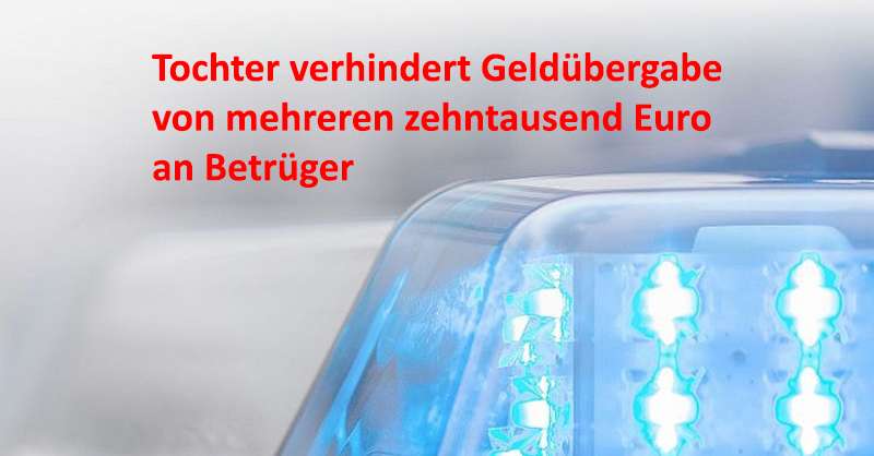 Um ein Haar hätte am Mittwoch eine Seniorin mehrere zehntausend Euro an Betrüger verloren. Eine Angehörige verhinderte die Geldübergabe. Die 78-Jährige erhielt am Abend einen Anruf: Angeblich habe ihre Tochter einen tödlichen Unfall verursacht. Der falsche Polizist forderte eine Kaution über mehrere zehntausend Euro. Die unter Schock stehende Seniorin erkannte nicht, dass sie einen Betrüger am Telefon hatte. Die Frau besorgte Geld und legte Schmuck für die Übergabe an den vermeintlichen Beamten bereit. Gerade noch rechtzeitig bekam die Tochter Wind von der Sache. Sie klärte ihre Mutter über die Betrugsmasche auf und verhinderte somit die Geldübergabe. Von den Betrügern fehlt bislang jede Spur. Die Polizei hat die Ermittlungen aufgenommen. |erf