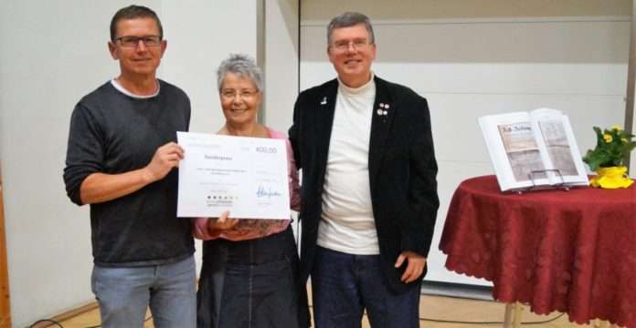 Foto: Asmus Kaufmann (links, Erster Vorsitzender) und Eric Lindon (rechts, Stellv. Vorsitzender) überreichen für den Vorstand des Vereins Pfälzische Sportgeschichte einen Symbolscheck über 400 Euro an Mireille Giel (Vorsitzende TSG Eisenberg). Foto: Schramm