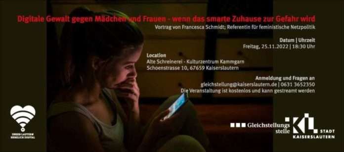 Thema des diesjährigen Aktionstags ist „Digitale Gewalt“. Durch das Internet, die sozialen Medien und die allgegenwärtige Verfügbarkeit von Endgeräten haben sich in den vergangenen Jahren völlig neue Möglichkeiten der Gewaltausübung gegenüber Frauen entwickelt. Um die Öffentlichkeit für diese Problematik zu sensibilisieren, wird es am Abend des 25. November um 18.30 Uhr einen Fachvortrag in der Kammgarn geben. Unter dem Titel „Digitale Gewalt gegen Mädchen und Frauen – wenn das smarte Home zur Gefahr wird“ wird Francesca Schmidt, Referentin für Feministische Netzpolitik und Gründungsmitglied von netzforma e.V., interessante Einblicke in dieses noch weitgehend unbekannte Thema geben. Wer will, kann die zusammen mit der KL.digital organisierte Veranstaltung auch online oder im Offenen Kanal Kaiserslautern verfolgen. Der Vortrag war bereits für 2021 geplant, musste damals aber kurzfristig abgesagt werden. Der Eintritt ist frei, um vorherige Anmeldung unter gleichstellung@kaiserslautern.de wird gebeten.
