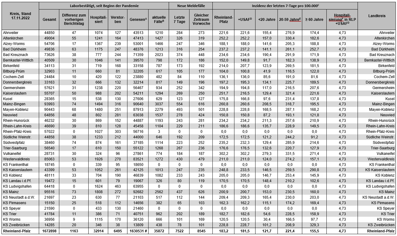 Coronavirus SARS-CoV-2: Fallzahlen für Rheinland-Pfalz, (Datenstand vom 17.11.2022, 14:10 Uhr)