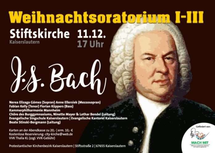 „Jauchzet, frohlocket!“, so beginnt Johann Sebastian Bachs Weihnachtsoratorium. Das bedeutendste deutschsprachige musikalische Werk zur Weihnachtszeit wird am 11. Dezember in der Kaiserslauterer Stiftskirche in einer besonderen Besetzung ab 17 Uhr aufgeführt. Der Klang der erwachsenen Chorstimmen wird durch viele junge Stimmen bereichert. Die Evangelische Kantorei und Singschule Kaiserslautern hat das Oratorium gemeinsam mit Chor-Ensembles des Burg-Gymnasiums einstudiert. Solisten und die Kammerphilharmonie Mannheim treten zusammen mit über 75 Choristen auf. Karten gibt es im Vorverkauf bei Thalia Kaiserslautern von 10,- bis 20,- zzgl. VVK-Gebühr.