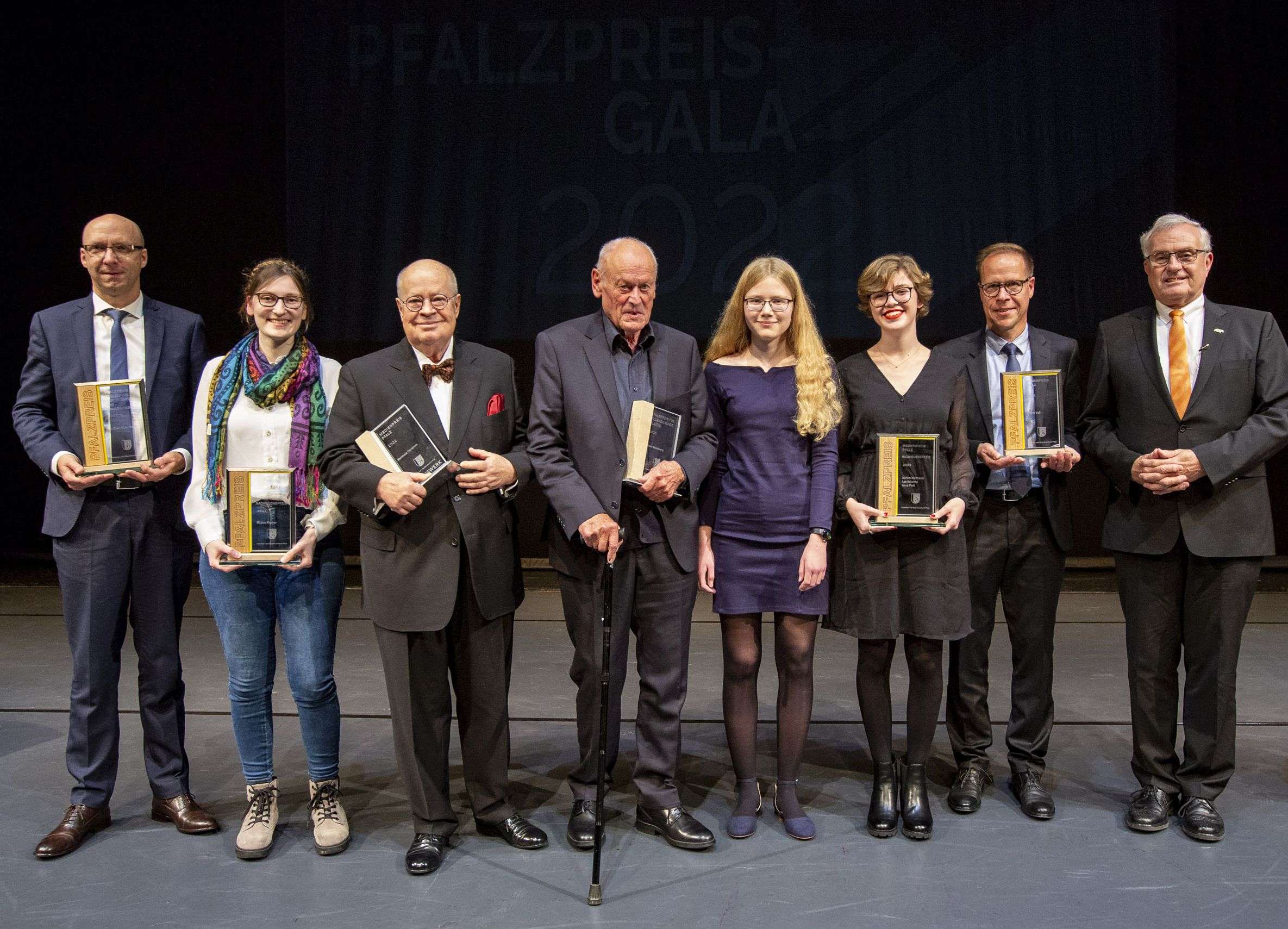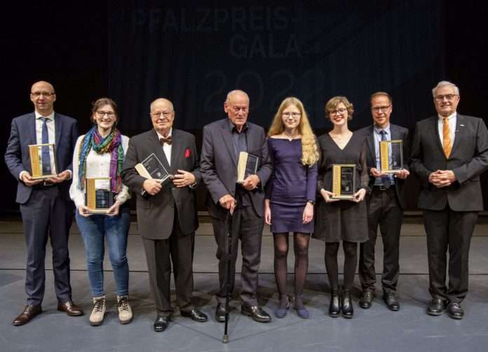 Die Preisträger und Preisträgerinnen bei der Pfalzpreis-Gala (von links): Dr. Sven Gütermann, Mirjam Fischer, Reinhold Gondrom, Erwin Wortelkamp, Anna Plett, Miriam Malthaner und Reiner Voß mit dem Bezirkstagsvorsitzenden Theo Wieder