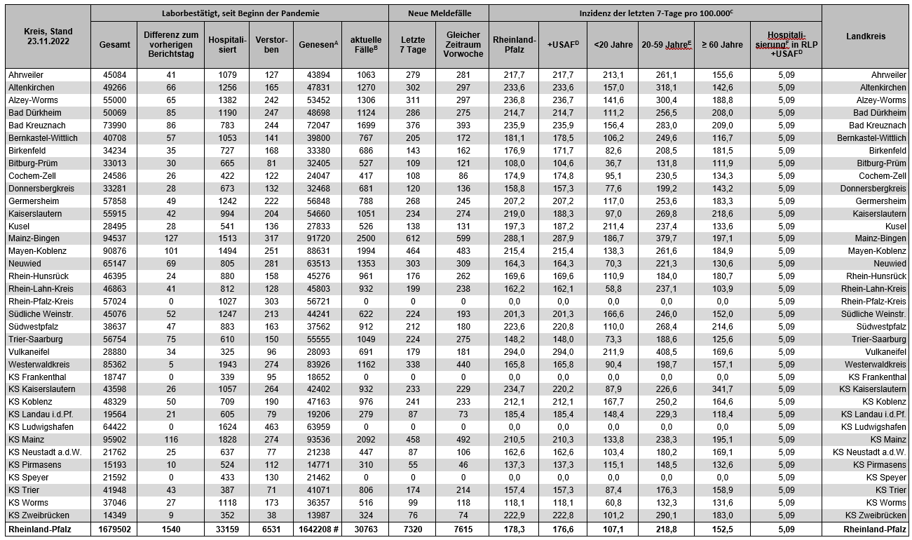 Coronavirus SARS-CoV-2: Fallzahlen für Rheinland-Pfalz, (Datenstand vom 23.11.2022, 14:10 Uhr)