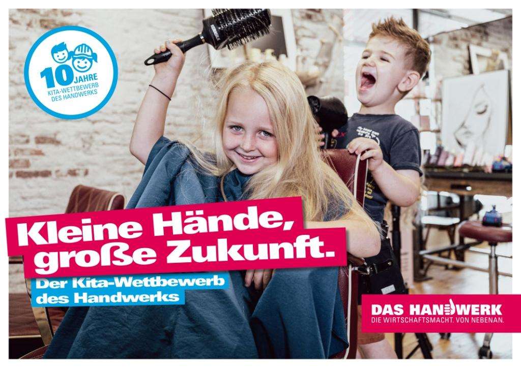 Der bundesweite Kita-Wettbewerb „Kleine Hände, große Zukunft“ geht in die zehnte Runde: Ab sofort können die Kinder wieder zusammen die Welt des Handwerks entdecken. Die Kleinen zwischen 3 und 6 Jahren dürfen nicht nur echten Handwerker*innen über die Schultern schauen und ein wenig zur Hand gehen. Nach dem Besuch stellen die Kinder selbst ein Rie- senposter her und haben die Chance auf einen tollen Gewinn.