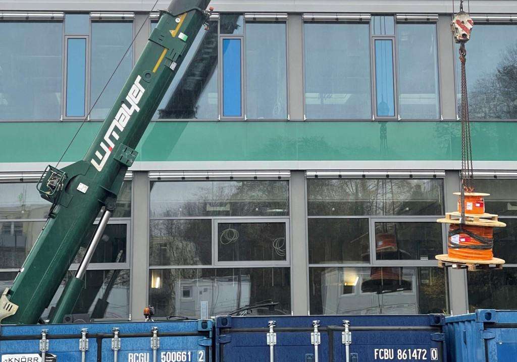 Bild: Ein Teil für das Hochspannungslabor wird per Kran in das neue Laborgebäude transportiert (Foto: HS KL)