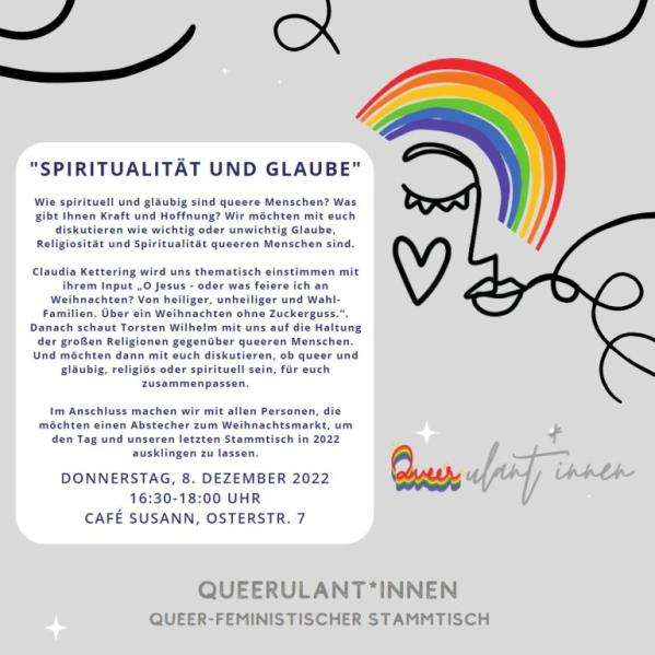 Wie spirituell und gläubig sind queere Menschen? Was gibt Ihnen Kraft und Hoffnung? Zu unse- rem Advents-Stammtisch möchten wir mit unseren Gäst*innen diskutieren wie wichtig oder un- wichtig Glaube, Religiosität und Spiritualität queeren Menschen sind.