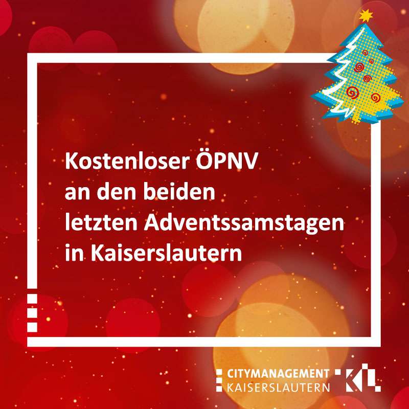 In Kaiserslautern können an den beiden Adventssamstagen am 10. und 17. Dezember die Busse des öffentlichen Personennahverkehrs kostenlos genutzt werden. Dies betrifft alle Buslinien der SWK-Verkehrs AG im Stadtgebiet (Wabe 800). Für Fahrten aus Orten im Landkreis Kaiserslautern in die Stadt bzw. zurück können auch die Busse der Verkehrsunternehmen DB Regio Bus Mitte und Regionalbus Westpfalz kostenlos genutzt werden.