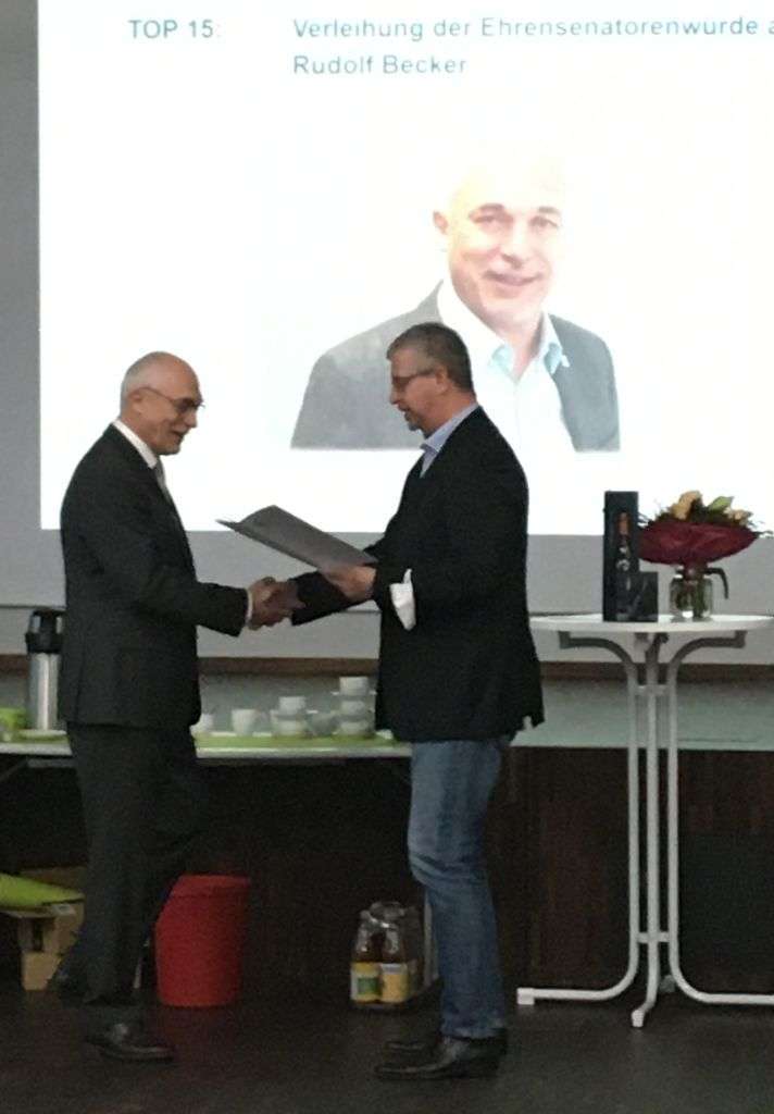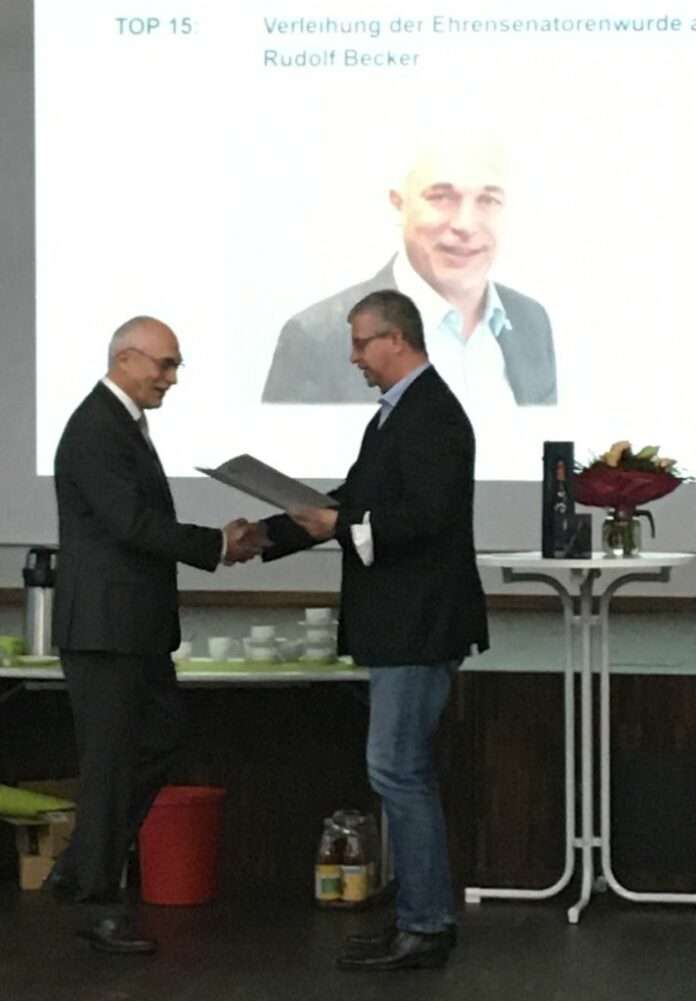 Die Ehrensenatorenwürde ist eine Auszeichnung, welche die Hochschule Kaiserslautern an Persönlichkeiten, die sich um die Hochschule und deren Entwicklung besonders verdient gemacht haben, verleihen kann. Durch Beschluss des Senats hat jetzt die Hochschule von dieser Möglichkeit Gebrauch gemacht und diesen Ehrentitel an Altkanzler Rudolf Becker verliehen. Nach Hans-Otto Streuber ist Becker damit erst der zweite Ehrensenator in der Geschichte der Hochschule Kaiserslautern; dies unterstreicht, wie außergewöhnlich der Einsatz des Geehrten für deren Entwicklung gewesen ist.