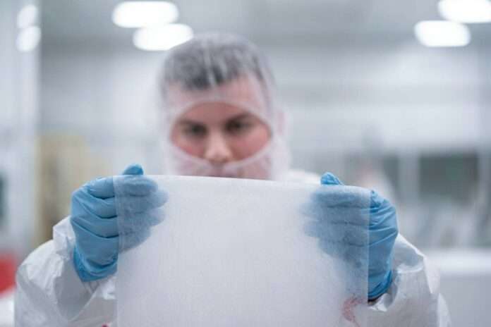 Die Vliesstoffe für die FFP-2-Masken müssen nach DIN mindestens 94 Prozent der Aerosole, Partikel oder Viren filtern. Im Bild: Qualitätskontrolle eines Meltblown-Materials im Reinraumbereich.