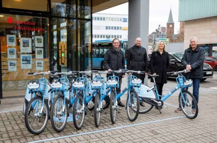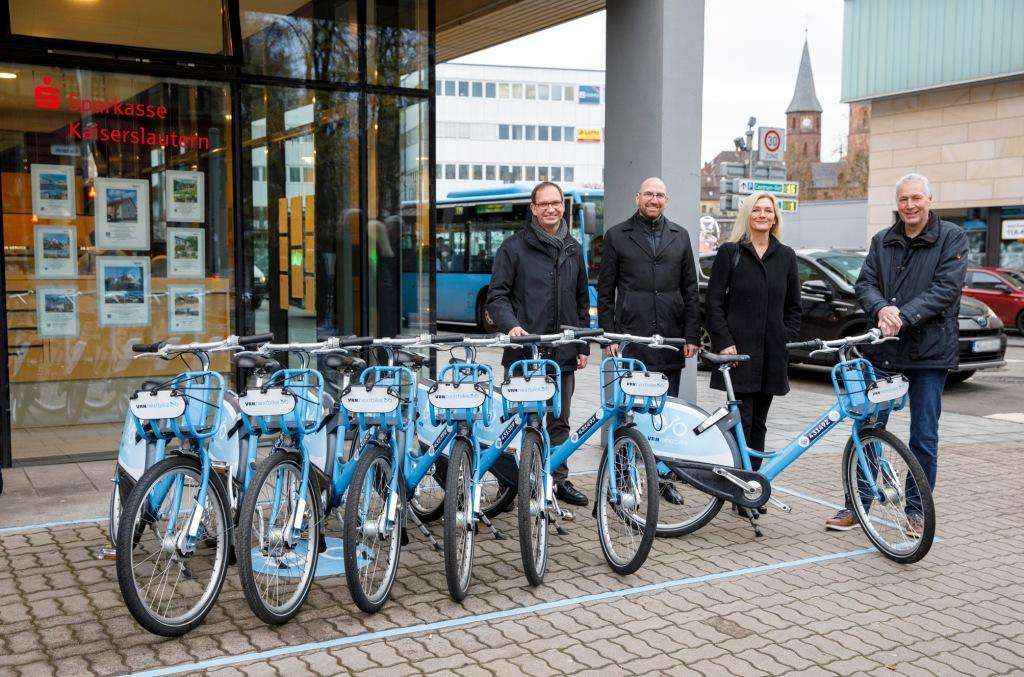 BU v.l.: Bei der Eröffnung der neuen VRNnextbike-Station vor der Sparkasse am Stiftsplatz: Frieder Zappe, Teamleiter Innovative Mobilitätsdienstleistungen, Hartmut Rohden, stellvertretender Vorstandsvorsitzender der Sparkasse Kaiserslautern, Beigeordneter Peter Kiefer und Andrea Brunnett, Marketingleiterin der Sparkasse Kaiserslautern