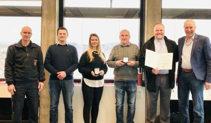 Bild v.l.: Thomas Höhe und Sascha Faber vom städt. Referat Feuerwehr und Katastrophenschutz, Anastasia Kirchner, Alexander Wesch, Ronny Fink, Beigeordneter Peter Kiefer