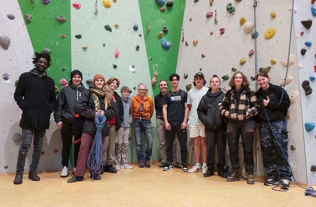 Intensives Klettertraining: Schülerinnen und Schüler der französischen Partnerschule mit Marco Elsner, MHK-Fachlehrer Metall (Sechster von rechts), und Sprachbegleiter Jacques Sateu Mengue (links)