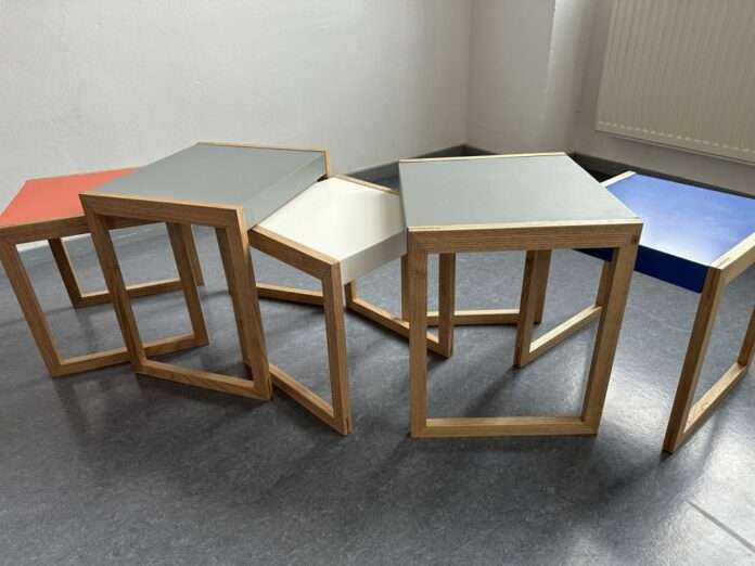 Das gemeinsame Hauptprojekt der angehenden Tischler und Tischlerinnen bestand in der Anfertigung zweier Tische, inspiriert von der Formensprache der Satztische von Josef Albers, dem deutsch-amerikanischen Maler, Kunstpädagogen und Lehrer am Bauhaus, dessen „bunte Tische“‘ längst zum Design-Klassiker geworden sind. Die Rahmen der beiden Tische, von denen der kleinere Tisch vollständig unter den großen geschoben werden kann, bestehen aus Edelkastanienholz, die Deckflächen des größeren Tisches aus Nadelsperrholz, das mit Linoleum belegt wurde, die des kleineren Tisches aus einer Holzfaserplatte, die lackiert wurde. Des Weiteren kamen einige raffinierte unsichtbare Verbinder (wie Minifix und Clamex) zum Einsatz, die zum einen das konstruktiv klare und schlanke Design der Tische ermöglichen, zum anderen die komplette Zerlegbarkeit der Möbel gewährleisten, was im Hinblick auf den Transport zurück nach Saint-Quentin einen wichtigen Aspekt darstellte.
