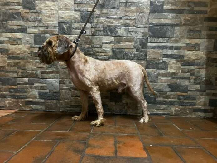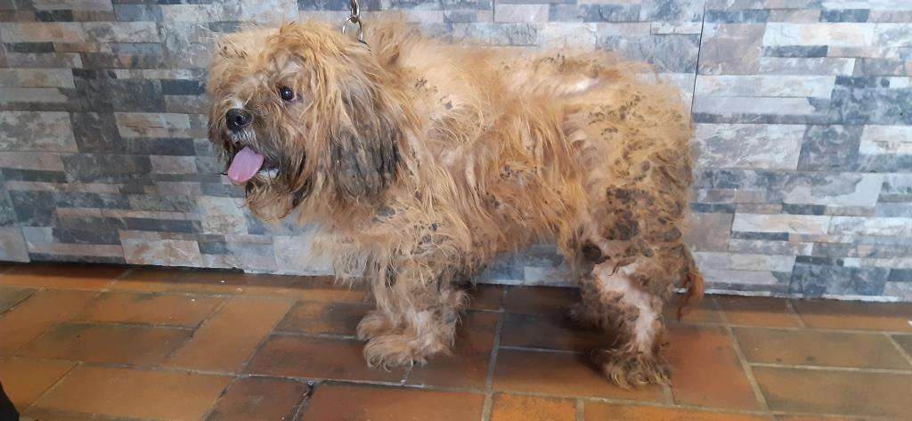Fotos: Hund Zottel bei der Wegnahme und unmittelbar nach einer ersten 4 stündigen Bade- und Scheraktion.
