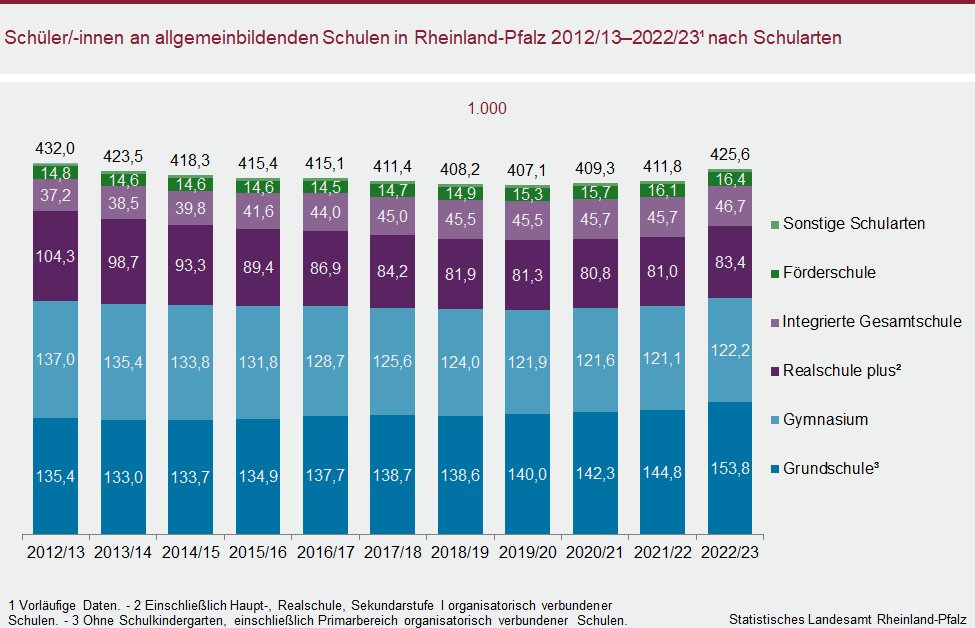 Nach vorläufigen Berechnungen des Statistischen Landesamtes besuchten zu Beginn des aktuellen Schuljahres 2022/23 rund 425.600 Kinder und Jugendliche eine der knapp 1.500 allgemeinbildenden Schulen in Rheinland-Pfalz. Damit stieg ihre Zahl gegenüber dem Vorjahr um etwa 13.800 bzw. um 3,3 Prozent.