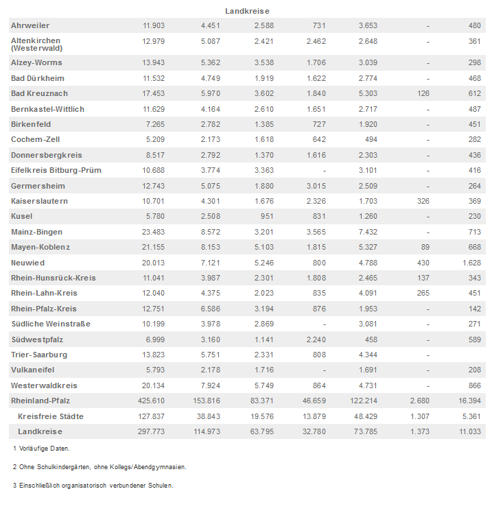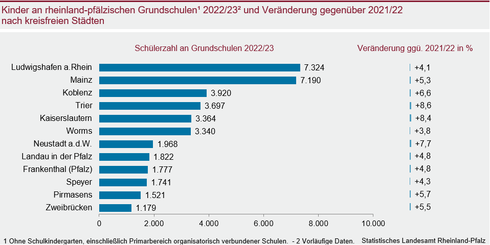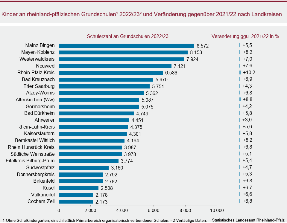 Alle Landkreise und kreisfreien Städte meldeten gegenüber dem Vorjahr einen Anstieg der Schülerzahlen an Grundschulen. Den größten Zuwachs verzeichnete der Rhein-Pfalz-Kreis mit mehr als zehn Prozent, gefolgt von Altenkirchen (plus 8,8 Prozent) und den kreisfreien Städten Trier (plus 8,6 Prozent) und Kaiserslautern (plus 8,4 Prozent). Vergleichsweise gering fiel die Entwicklung im Landkreis Ahrweiler (plus 3,0 Prozent) aus, in dem viele Schulen 2021 noch erheblich von der Flutkatastrophe im Ahrtal betroffen waren.