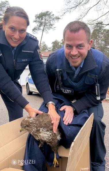 Das ausgerückte Streifenteam konnte den Vogel bergen. Er wirkte benommen und desorientiert. Erste Vermutung der Polizisten: Wahrscheinlich war der Bussard mit einem Fahrzeug kollidiert und dann zu Boden gestürzt. Glücklicherweise wurde er nicht auf die Fahrbahn geschleudert und überfahren.