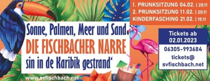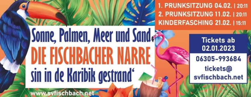 Unter dem Motto „Sonne, Palmen, Meer und Sand, die Fischbacher Narre sin in de Karibik gestrand'“, haben unserer Aktiven wieder ein tolles und abwechslungsreiches Programm auf die Bühne gezaubert. Lassen Sie sich entführen in eine farbefroh dekorierte Halle, die Lust auf Tanzen, Mitsingen und Cocktails macht. Wir bieten aber noch viel mehr!