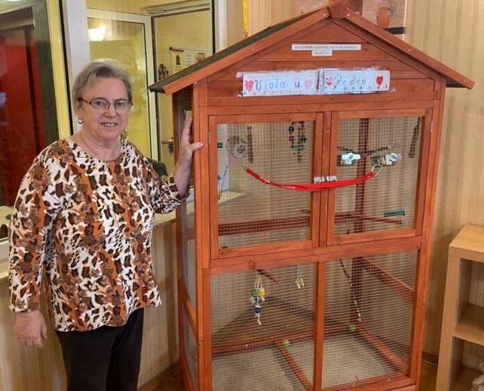 Zwei neue Bewohner im Kursana Domizil sind echte Überflieger und haben schon viele Fans gefunden. „Pedro“ und „Viola“ heißen die beiden Wellensittiche, die auf dem Flur im Wohnbereich Lautertal gelandet sind. Eine Bewohnerin hatte die beiden bunte Vögel angeschafft, konnte sich dann aber nicht mehr um ihre zwitschernden Lieblinge kümmern. Niemand brachte es übers Herz, „Pedro“ und „Viola“ außer Haus unterzubringen, schnell fanden sich einige Senioren, die sich für die Wellensittiche begeistern und die sie auch pflegen möchten. Damit es für alle möglich ist, die Vögel zu besuchen und sie zu beobachten, hat Direktorin Silvia Mosebach-Kube eine Voliere angeschafft, in der „Pedro“ und „Viola“ jetzt zuhause sind. Täglich kommen Bewohnerinnen und Bewohner vorbei, nehmen auf den Stühlen vor dem großen Käfig Platz und schauen sich das putzige Spiel der Wellensittiche an. Sonia Maurer (Foto) ist begeistert von den beiden Vögeln. Sie kümmert sich gern um das Duo und hat den Namensschriftzug mit den roten Herzen an der Voliere selbst gestaltet.