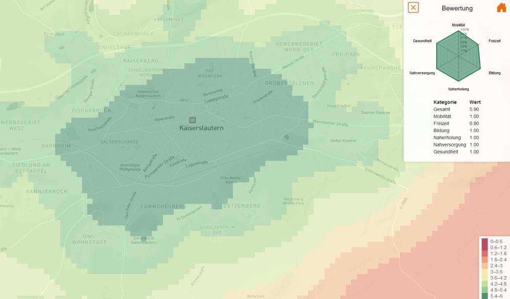 5,9 von 6 Punkten für die Fruchthallstr., 5,83 für das Klinikum in Kaiserslautern. Das ist das Ergebnis der Analyse von 15-Minuten-Stadt.de. Hintergrund ist die Idee der Stadt der kurzen Wege: Die wichtigsten Einrichtungen des täglichen Lebens sollen fußläufig, mit dem Rad oder mit Bus und Bahn möglichst in 15 Minuten erreichbar sein – also zum Beispiel Arztpraxen, Supermärkte, Freizeitangebote, Schulen oder Bushaltestellen.