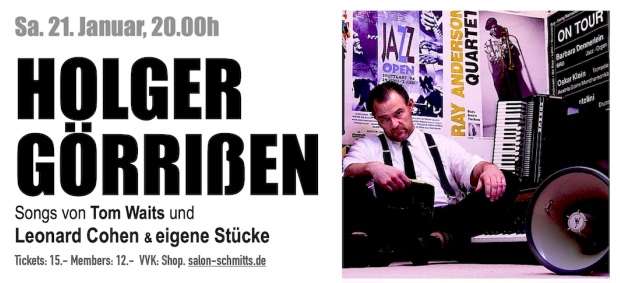 Talk, Drinks und Lage der Frisur. Sekt und Selters frei für Members :)Samstag den 21. Januar dann Holger Görrißen mit Songs von Tom Waits, Leonhard Cohen und Eigenkompositionen.Holger Görrßen hat überigens den Salon am 26.09. 2015 musikalisch eingeweiht – es war das erste Live Konzert überhauptauf unserer Bühne und wir waren sehr nervös – aber volles Haus, grandioser Gig und ein gutes Omen.Beginn ist 20.15 – Einlass 19.00h und der VVK läuft oder reservieren unter hallo@salon-schmitts.deAm 26. Januar dann „Peace“ – Kirsti Alo präsentiert Ihre Singklasse der Emmerich Smola Musikschule Kl mit Antikriegs-Songs.Der Eintritt ist frei !!!