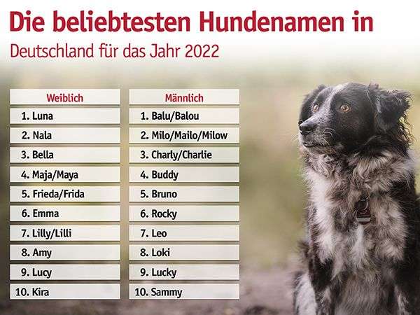 Bei den Rüden bleibt Balu der Favorit. Milo belegt erneut den zweiten Platz, gefolgt von Charlie auf dem dritten Platz. Auf den Rängen vier bis sieben folgen Buddy, Bruno, Rocky und Leo. Loki feiert bei den Hundenamen Premiere und steigt auf Platz 8 ein, gefolgt von Lucky und Sammy. Der Name Max, der sich in den vergangenen Jahren immer auf den hinteren Plätzen gehalten hatte, schafft es 2022 nicht mehr in die Hitliste.