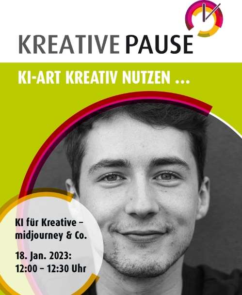 In der nächsten KREATIVEN PAUSE am 18. Januar 2023 um 12 Uhr stellt Leonard Bäcker, ein Virtual Design Student aus Kaiserslautern, seine kreative Ideenfindung mit KI-Art vor. Er zeigt am Beispiel von midjourney wie KI-Art verwendet wird und wie es in seine Arbeit einfließt.