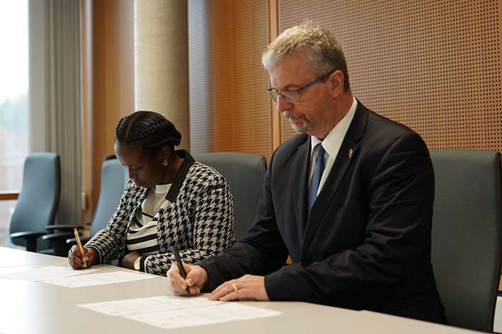 Sie setzten Ihre Unterschrift unter das Memorandum of Understanding: Vice-Chancellor Dr. Sylvie Mucyo, Rwanda Polytechnic, und Präsident Prof. Dr.-Ing. Hans-Joachim Schmidt, Hochschule Kaiserslautern. (Foto: HSKL)