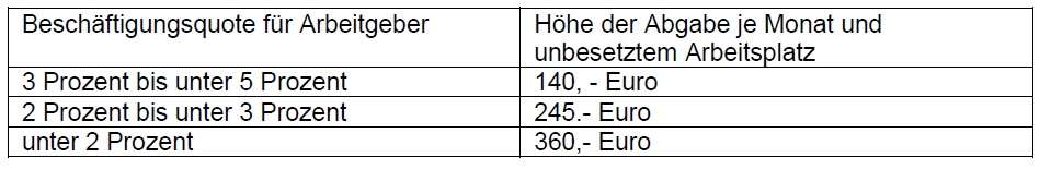 Unternehmen mit weniger als 40 Arbeitsplätzen müssen einen schwerbehinderten Menschen beschäftigen. Sie zahlen je Monat 140 Euro, wenn sie diesen Pflichtplatz nicht besetzen.