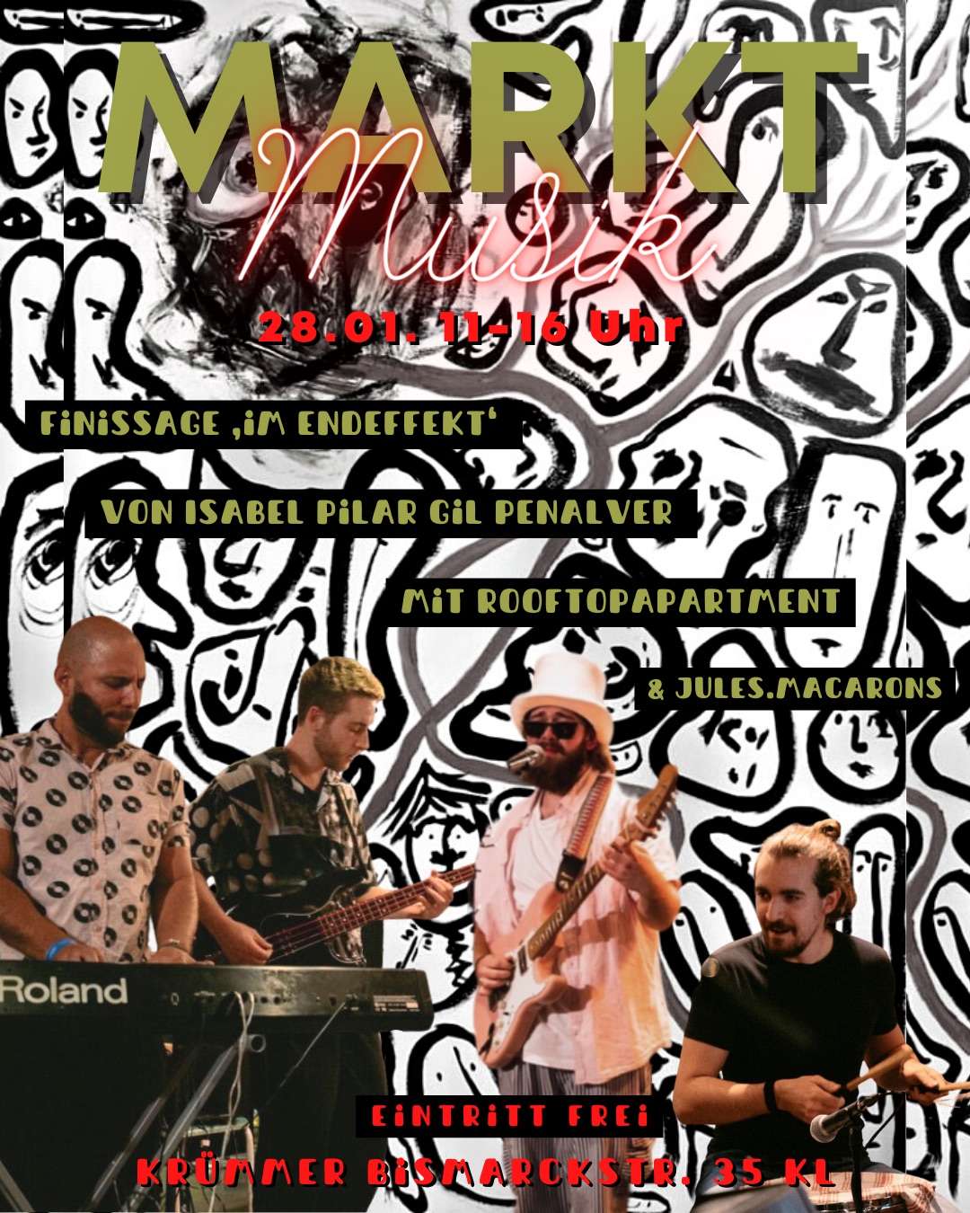 Nächsten Samstag (28.1.) begrüßen wir euch ab 11 Uhr zur Marktmusik mit der Band Rooftopapartment & Jules Macarons . Wir verabschieden uns von der Ausstellung von Iisabel Pilart in unserem Raum, nutzt die letzte Chance die Ausstellung ‚im Endeffekt‘ bei uns sehen zu können!