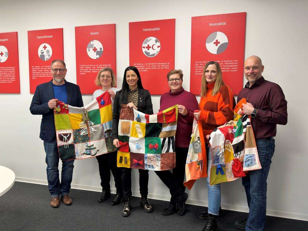 BU: Axel Gilcher (Vorstand des DRK Kreisverband Kaiserslautern-Stadt), Diana Sajons (Stellvertretende Referatsleiterin für Soziales), Beigeordnete Anja Pfeiffer, Annika Lange (Ökologieprogramm), Nicole Jörg (Beratungs- und Koordinierungsstelle Demenz DRK), sowie Heiko Becker (Sozialplanung der Stadt Kaiserslautern) bei der Übergabe der Nesteldecken.