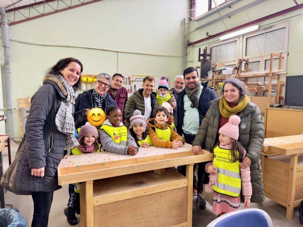 BU: Die Kinder zusammen mit ihren Erziehern, Vertreterinnen des Jugendamtes sowie Vertreter des ASZ in der Werkstatt