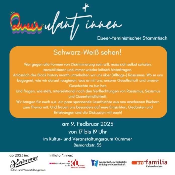Am 9. Februar laden die Queerulant*innen zu ihrem elften queer-feministischen Stammtisch in den kulturellen Veranstaltungsraum Krümmer von 17 bis 19 Uhr ein.