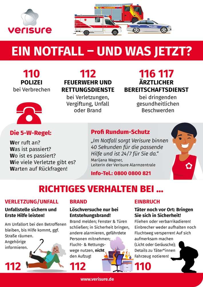 Bildunterschrift: Zum 50-jährigen Jubiläum der Notrufnummer 112 dankt Sicherheitsanbieter Verisure Feuerwehren und Rettungskräften und gibt einen Notfall-Überblick. Wer bei einem Unfall, Herzproblem, Feuer, Wasser oder Einbruchsversuch etc. nicht selbst überlegen möchte, welche Art von Hilfe mit welchen Informationen zu kontaktieren ist, findet bei Verisure qualifizierte Fachkräfte, die Tag und Nacht auf jedes eingehende Signal sekundenschnell reagieren und sich um Menschen zuhause wie auch unterwegs kümmern, bis diese die notwendige Hilfe erhalten und wieder in Sicherheit sind.