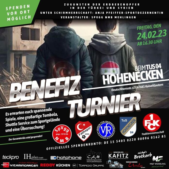 Am 24. Februar findet auf dem Gelände des TuS 1904 Hohenecken, der sofort Unterstützung zugesagt hat, ab 16:30 Uhr ein Blitzturnier u.a. mit den Mannschaften Fatihspor Kaiserslautern, VfR Kaiserslautern und SpVgg NMB Mehlingen statt.