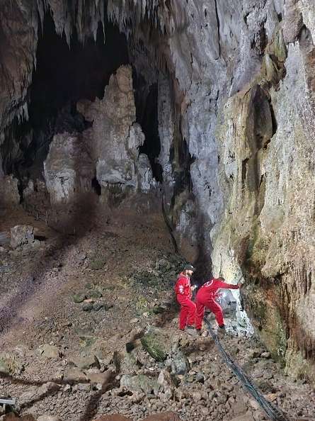 Foto: Höhlensystem in Kantabrien, Spanien: die Forscher unterwegs in der Escalon-Höhle beim Untersuchen der Biofilme aus Cyanobakterien, die an den Höhlenwänden wachsen. (Foto: Jung)