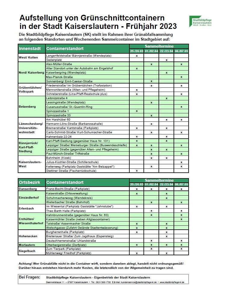 Für den anstehenden Pflanzenrückschnitt in vielen Gärten stellt die Stadtbildpflege Kaiserslautern (SK) auch in diesem Frühjahr zwischen dem 25. März und 07. Mai kostenlose Grünschnitt-Container im Stadtgebiet zur Verfügung. An insgesamt vier Wochenenden unterstützt die SK die Bürgerinnen und Bürger bei der Entsorgung ihres Grünabfalls. Die Standorte und Standzeiten der Sammelcontainer sind unter www.stadtbildpflege-kl.desowie in der App der SK veröffentlicht. Die SK bittet darauf zu achten, dass die Container aufgrund parkender Fahrzeuge möglicherweise in der Nähe der veröffentlichten Standorte aufgestellt werden müssen.
