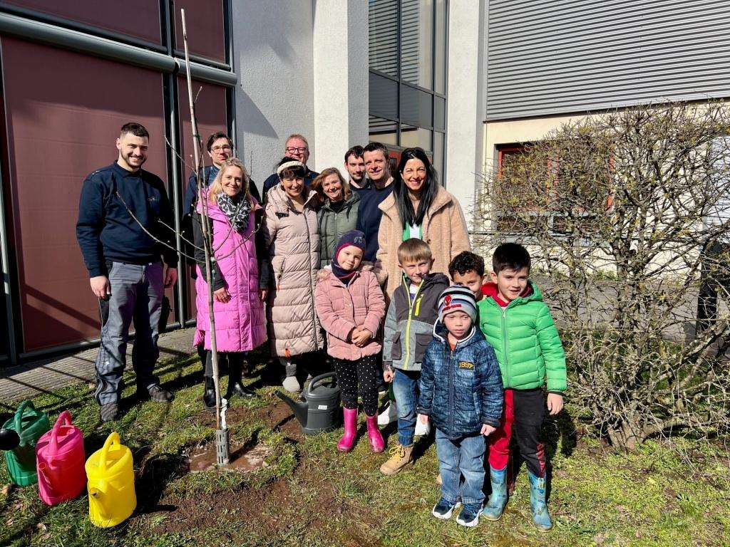 Das Nachhaltigkeitsprojekt ‚Naschapfelbaum‘ diente auch als Team-Building-Aktion der Firma EUS, da Mitglieder der Geschäftsleitung und Mitarbeiterinnen und Mitarbeitern zusammen mit den Kindern die insgesamt 25 Bäume pflanzten. Unter Leitung von Sabine Günther vom Obst- und Gartenbauverein Kaiserslautern, waren Geschäftsführer Thomas Haffner und Prokurist Ingo Catarius von EUS tatkräftig dabei. Es wurde gegraben, gepflanzt, versorgt und gegossen. Die neuen Bäumchen werden bei liebevoller Fürsorge durch die Kinder voraussichtlich nächstes Jahr die ersten Früchte tragen, die dann direkt vom Baum genascht werden können.