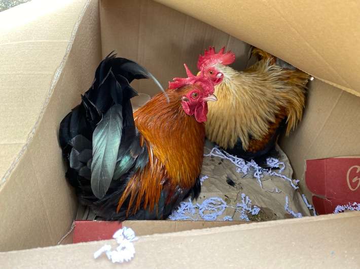 Am Montag den 03.04.2023 wurde die Polizeiautobahnstation Kaiserslautern von der Autobahnmeisterei Wattenheim verständigt. Gegen 09:45 Uhr wurde an der Salzhalle an der Autobahnausfahrt Enkenbach-Alsenborn ein mit Klebeband verschlossener Karton gefunden. Beim Öffnen entdeckten die überraschten Arbeiter zwei Hähne, die man scheinbar einfach ihrem Schicksal überlassen hatte. Bei der ersten Inaugenscheinnahme der Tiere wurde festgestellt, dass diese deutlich unterernährt waren. Zudem konnte man annehmen, dass sie aufgrund ihrer langen Krallen in ihrem bisherigem Leben wenig Auslauf hatten. Die Hähne wurden in die Obhut des Tierschutzes übergeben. Im Rahmen der Ermittlungen bittet die Polizeiautobahnstation um Hinweise.