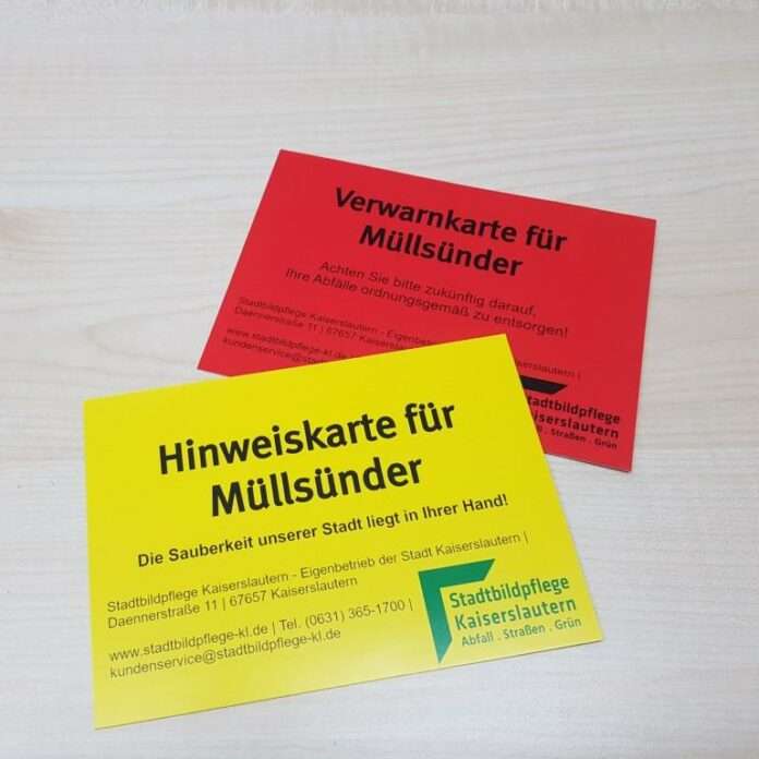 Seit dem letzten Jahr sind die City-Wächter der Stadtbildpflege Kaiserslautern (SK) regelmäßig in der Innenstadt unterwegs. Sie leisten Aufklärungsarbeit und sind Ansprechpartner für Bürgerinnen und Bürger, die Müllablagerungen und Ordnungswidrigkeiten beobachten. Ab Mitte April werden die City-Wächter nun eine Hinweiskarte an all diejenigen verteilen, die ihren Abfall achtlos wegwerfen und so die Stadt verschmutzen. Nach einige Wochen werden statt den Hinweiskarten nur noch Verwarnkarten an die Müllsünderinnen und -sünder vergeben. Eine Verwarnkarte zieht direkt ein Bußgeldverfahren nach sich. Ziel dieser Maßnahme ist es, das achtlose Wegwerfen von Abfällen zu reduzieren und so für eine sauberere Innenstadt zu sorgen.