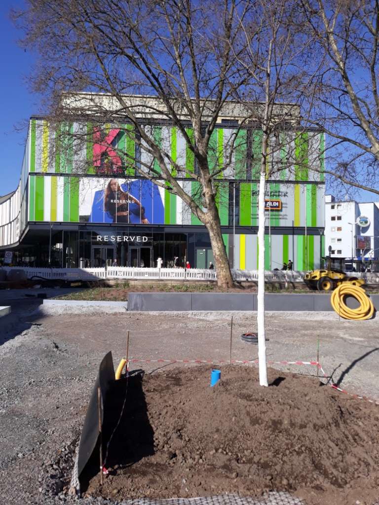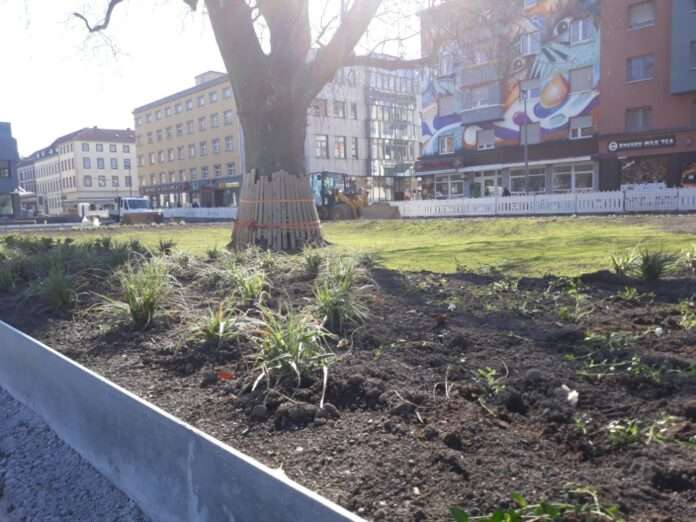 Überall blüht und grünt es – so nun auch in der Neuen Stadtmitte. Anfang der Woche wurden zwei Erlen und eine Hainbuche im Bereich um den Fackelbrunnen sowie zahlreiche Bodendecker neu gepflanzt. Wenn die Baustelle weiter fortgeschritten ist, findet im Herbst die nächste Pflanzaktion im Herzen der City statt.