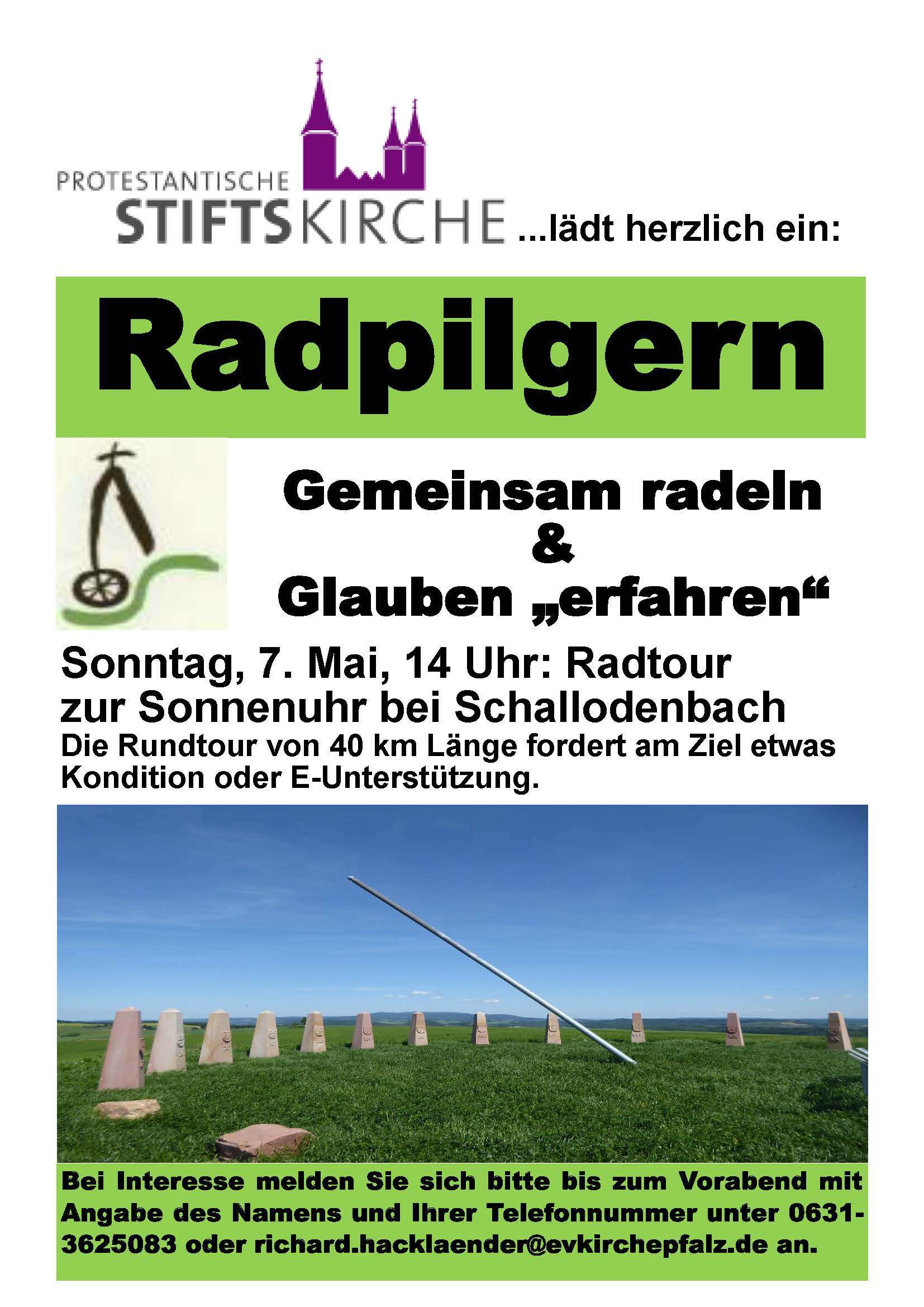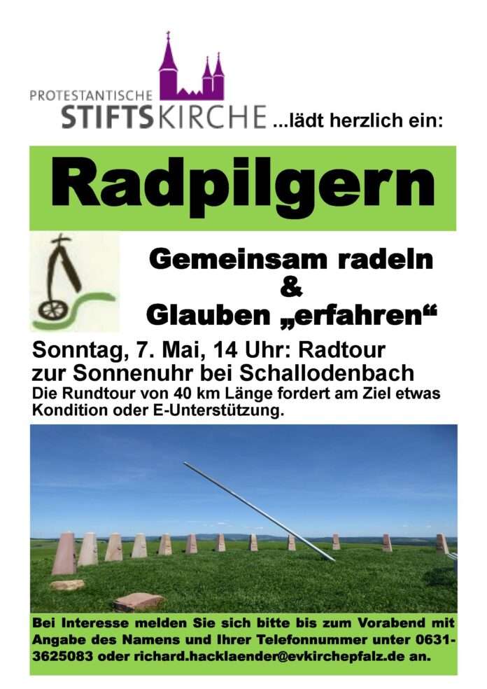 Im Rahmen des Stadtradelns bietet die Prot. Stiftskirchengemeinde Kaiserslautern in ihrer Reihe „Radpilgern“ am Sonntag, 7. Mai, ab 14 Uhr eine Halbtagestour von Kaiserslautern-Stiftskirche zur begehbaren Sonnenuhr bei Schallodenbach an. Dekan Richard Hackländer und Pfarrer Matthias Jung leiten diese Radtour von etwa 40 km unter dem biblischen Motto „Alles hat seine Zeit.“ Um Anmeldung wird gebeten unter richard.hacklaender@evkirchepfalz.de oder unter 0631-3625083.