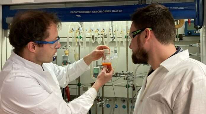 Bu: Professor Manolikakes (li.) und sein Mitarbeiter Jan Philipp Nau bei einer chemischen Fixierung von Schwefeldioxid. Foto: RPTU/AG Manolikakes