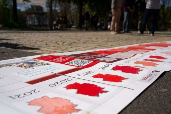 Das knapp 30 Meter lange Bodenbanner war am Mittwoch, den 03. Mai, gemeinsam mit der Bürgerinitiative KlimaLautern und der Stabsstelle Bildung und Ehrenamt auf dem Platz vor dem Pfalztheater ausgerollt worden. Es veranschaulicht mit blauen und roten Jahresstreifen, den sogenannten „warming stripes“, die der britische Klimawissenschaftler Ed Hawkins entwickelt hat, die fortschreitende Erderwärmung seit dem Beginn der Klimaaufzeichungen im Jahr 1850. Die aufgedruckten QR-Codes liefern vertiefende Informationen, wie beispielsweise Kurzfilme oder auch Tonaufnahmen eines abschmelzenden Gletschers.