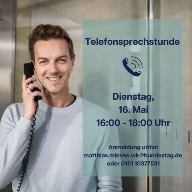 Der Bundestagsabgeordnete Matthias Mieves bietet am Dienstag, den 16. Mai, von 16:00 bis 18:00 Uhr seine Telefonsprechstunde an. Interessierte Bürgerinnen und Bürger aus seinem Wahlkreis können mit ihm über ihre Anliegen sprechen. Anmeldungen erfolgen unter matthias.mieves.wk@bundestag.de oder unter 0151 10377531.