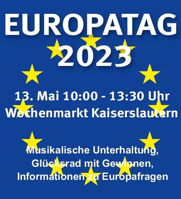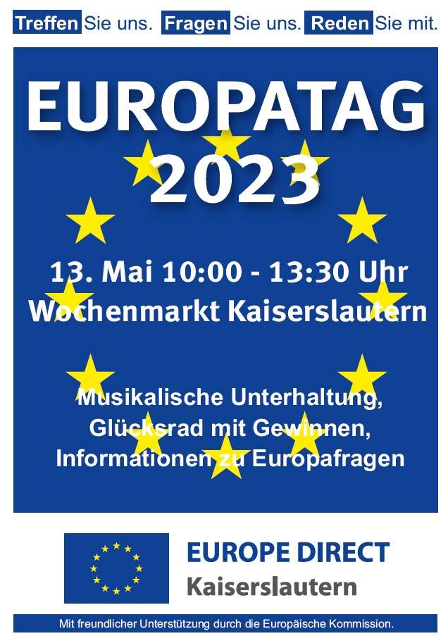 Am Samstag, den 13. Mai 2023, lädt das Europe Direct Kaiserslautern von 10 bis 13.30 Uhr auf den Wochenmarkt auf dem Stiftsplatz zum Besuch seines Informationsstandes ein. Anlässlich des Europatages, der alljährlich am 9. Mai seinen Platz im Kalender hat, gibt es gleich am Eingang zum Markt aktuelle Informationen, interessante Gespräche zu Europathemen und Mitmachaktionen für Alle. Hierzu gehört ein EU-Quiz bei dem es attraktive Preise in Form von Gutscheinen für Produkte der Wochenmarkt-Beschicker zu gewinnen gibt. Außer Informationsbroschüren gibt es auch kostenlose EU-Utensilien für Kinder und Erwachsene. Die Marktbesucherinnen und -besucher und die Gäste der angrenzenden Gastronomie dürfen sich zudem wieder über die musikalische Begleitung durch Thomas Weithäuser mit seinem Saxophon freuen.