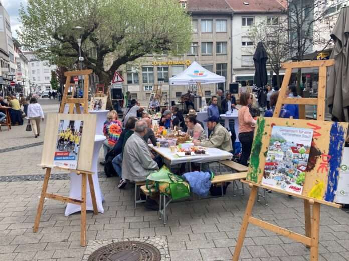 Neben der Straßenkunst stand die Innenstadt Kaiserslauterns am Samstag auch ganz im Zeichen der Inklusion. Anlässlich des europäischen Protesttags zur Gleichstellung von Menschen mit Behinderungen am 5. Mai hatte eine Arbeitsgruppe um Steffen Griebe, dem Beauftragten für die Belange von Menschen mit Behinderung der Stadt Kaiserslautern, zum gemeinsamen Essen an den Riesenbrunnen geladen. Wer wollte, konnte sich einfach dazu setzen und auch gerne seine eigenen Speisen und Getränke mitbringen. Seitens der Veranstalter standen Kaffee, Erfrischungsgetränke sowie kleine Snacks parat. Die plakative Ausstellung „Orte für alle – Zukunft barrierefrei gestalten“ und die Live-Musik von Barnickel & Wood taten ein Übriges, um allerlei Menschen anzulocken, die sich gerne die Zeit für einen kleinen Austausch nahmen.